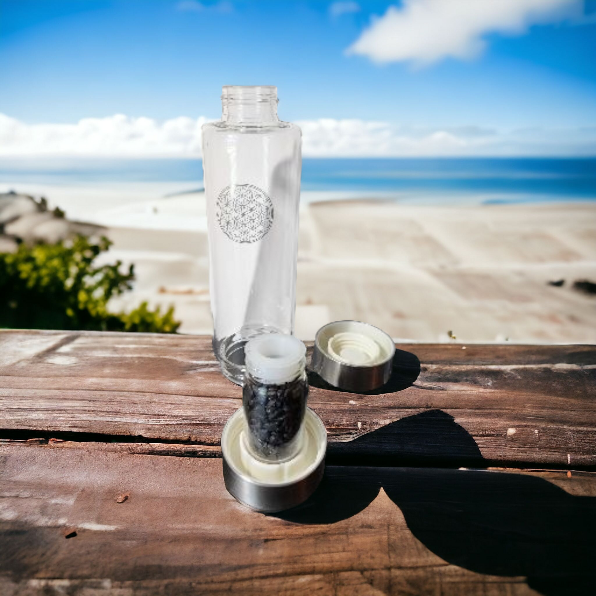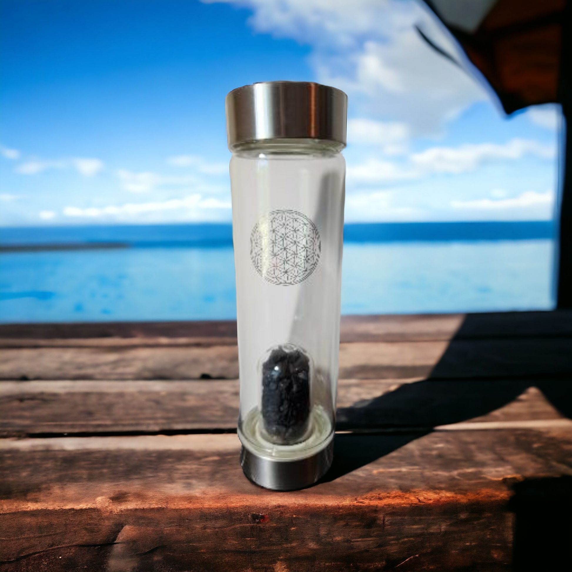 Shungite is often associated with purification and protection, believed to absorb and eliminate any negative energies. When used in water bottles, it's thought to contribute to the detoxification of the body, aligning with the concept of water as a cleansing element. Shungite is said to ground and protect, linking to the root chakra, which is the foundation of physical and spiritual energy. It's seen as a neutralizer, balancing the body's energies and promoting a sense of well-being.
